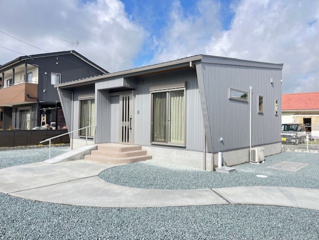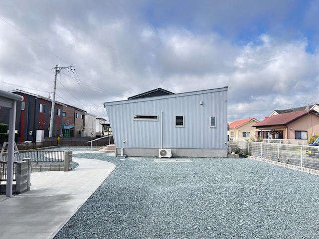 外観はシルバーのガルバリウム鋼板の外壁が特徴的ですね。ぱっと見はグレー色に見えますが近づくと